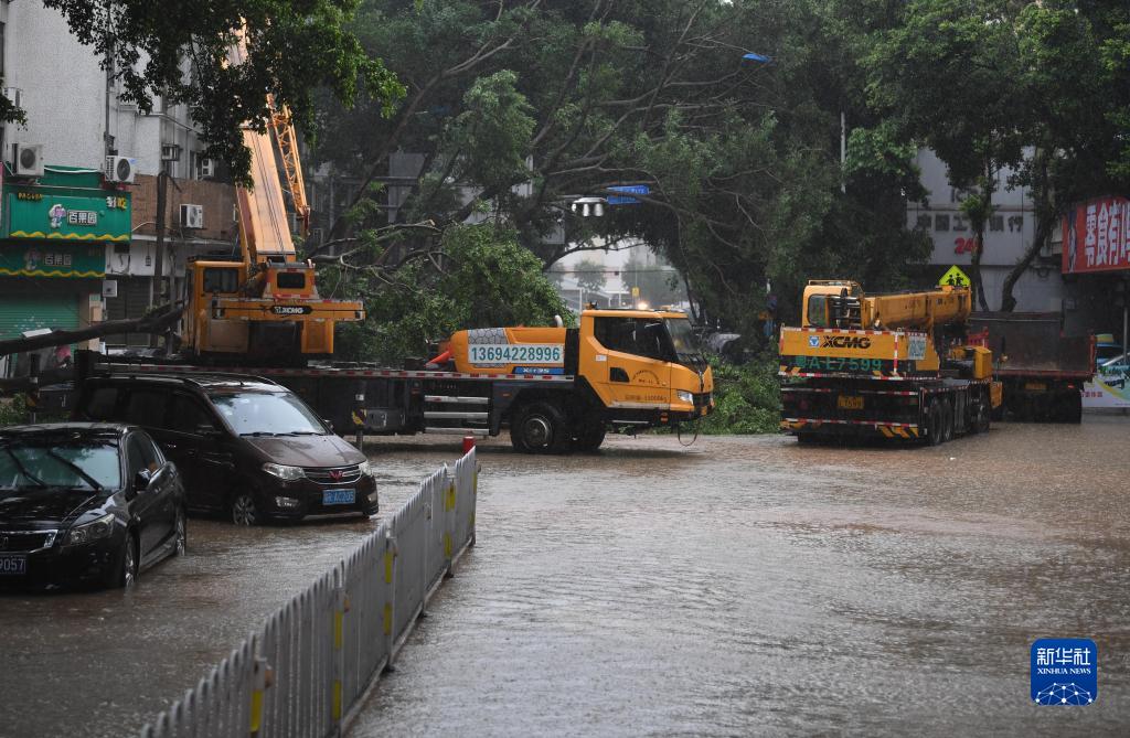 9月8日,在廣州市番禺區(qū)康樂路,工作車輛在清理倒伏樹木。