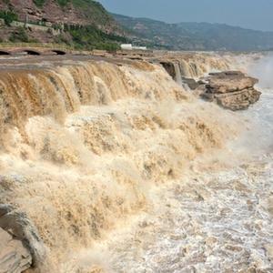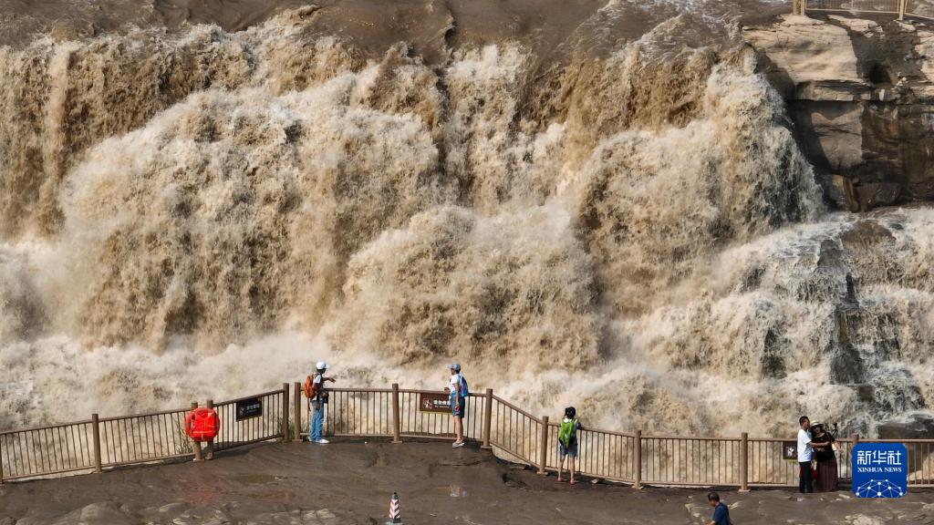 近日,受上游降雨和水庫調節放水影響,黃河壺口瀑布主副瀑布連成一線,滾滾黃河水奔騰而下,吸引游客駐足觀看。