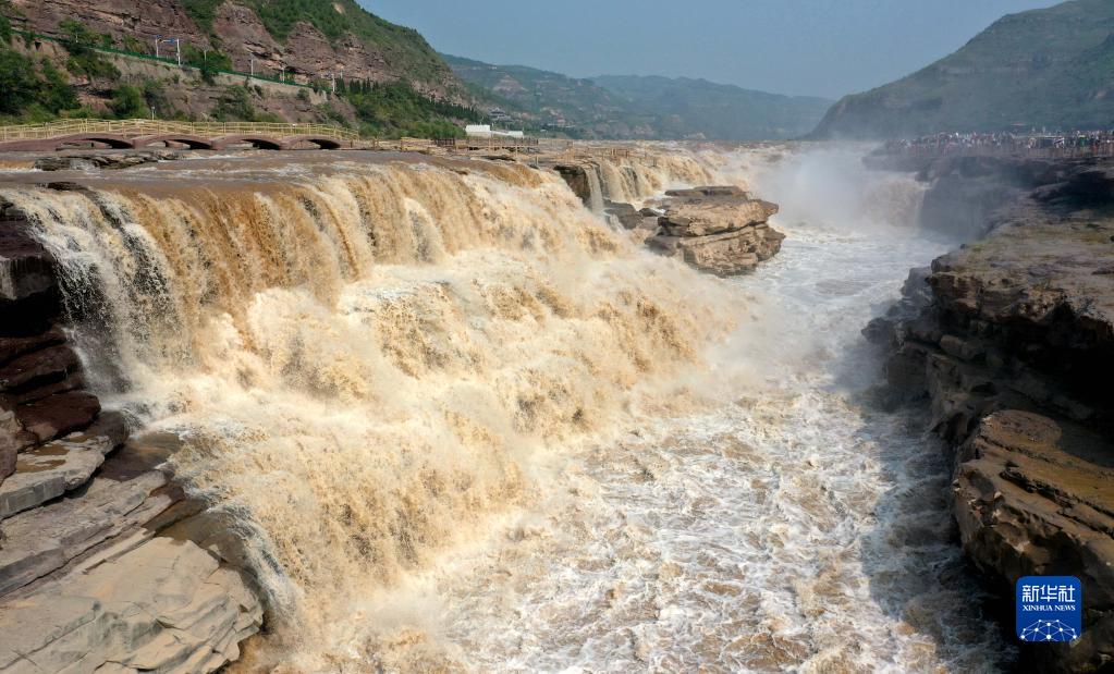 近日,受上游降雨和水庫調節放水影響,黃河壺口瀑布主副瀑布連成一線,滾滾黃河水奔騰而下,吸引游客駐足觀看。