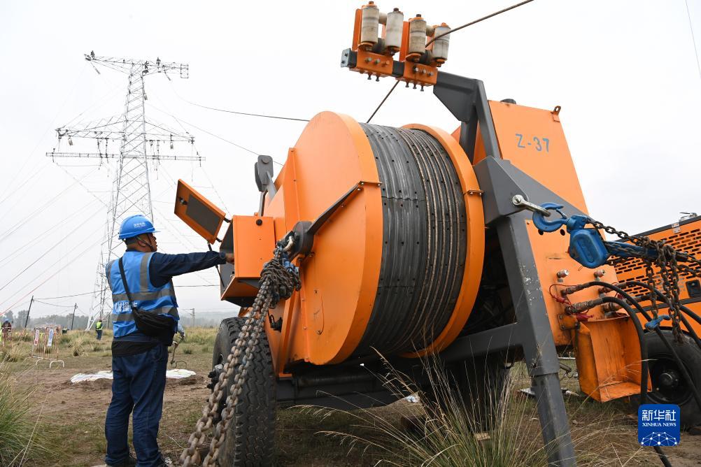 9月8日,工人在武威市天祝縣境內的蘭新(張)三四線甘肅牽引站330千伏外部供電工程施工現場作業。