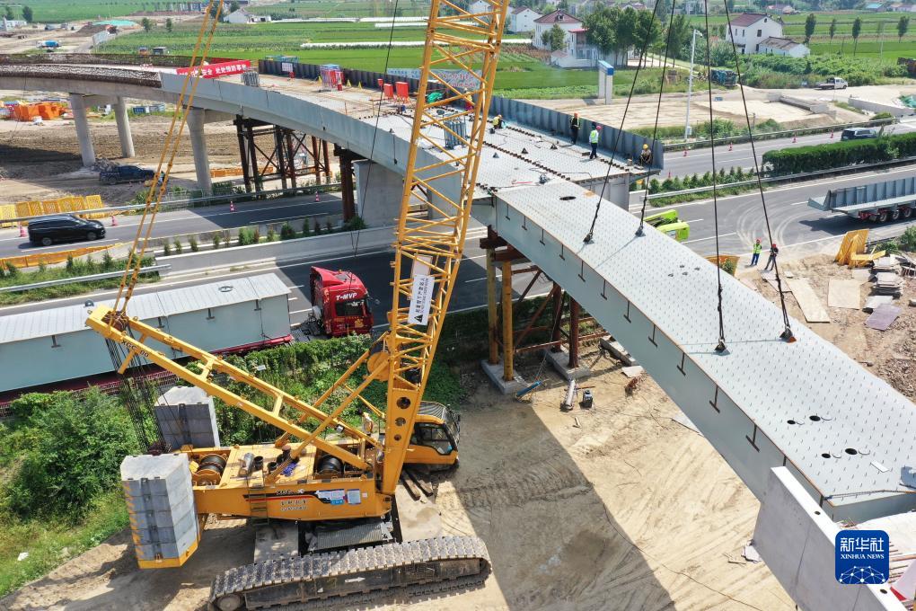 9月8日在江蘇省東臺市拍攝的東興高速上跨G15沈海高速架梁作業現場(無人機照片)。