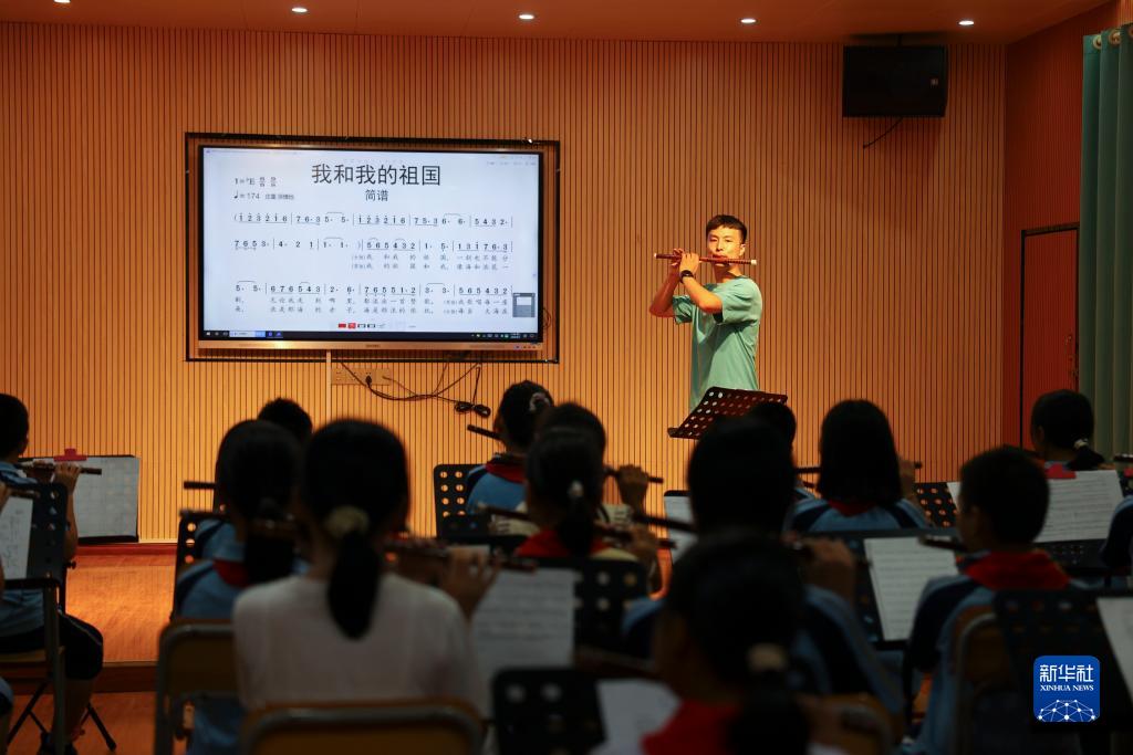 在江西省吉安市泰和縣水槎鄉中心小學,肖惠文給孩子們上竹笛課(9月5日攝)。