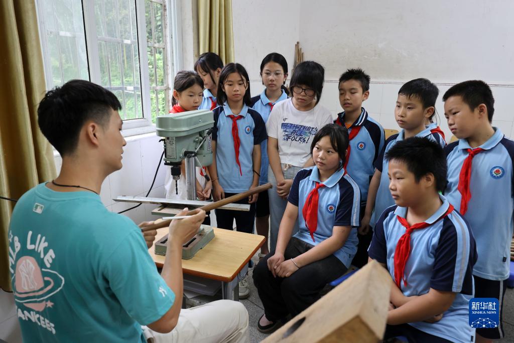 在江西省吉安市泰和縣水槎鄉中心小學,肖惠文教孩子們制作竹笛(9月5日攝)。