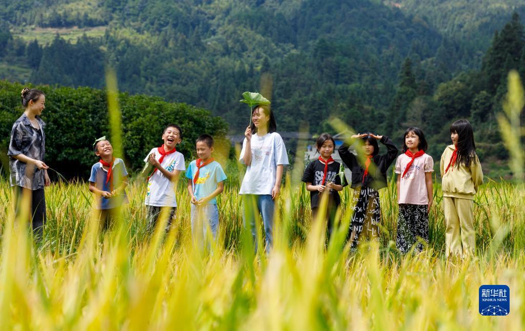 9月7日,在通道縣獨坡鎮上巖村,已畢業一年多的“定向師范生”吳玉卓(左一)、楊海琪(中)帶學生來到稻田邊開展課外實踐活動。