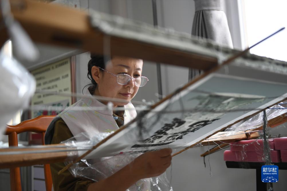 9月8日,在寶雞西秦刺繡文化產業園,千陽繡娘在刺繡。陜西千陽縣是國家級非物質文化遺產“西秦刺繡”的重要發祥地和傳承地。近年來,千陽縣將西秦刺繡作為助農增收的重要產業,推動非遺項目產業化發展,助力鄉村振興。
