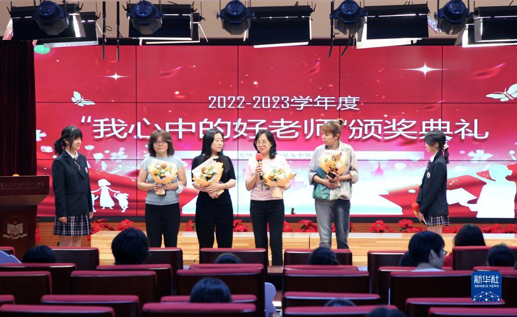 教師節即將來臨之際,北京師范大學實驗華夏女子中學舉辦迎接教師節主題活動,師生共聚一堂,弘揚尊師重教的傳統。新華社記者 侯俊 攝