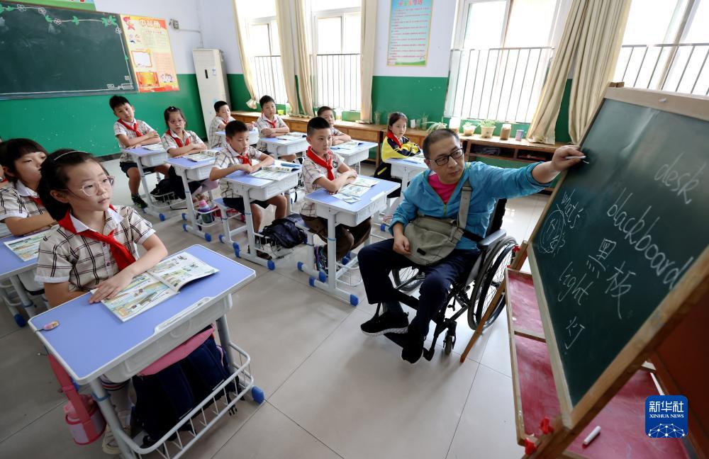 9月4日,在山東省棗莊市永安鎮遺棠小學,楊季剛在教室給四年級學生上英語課。