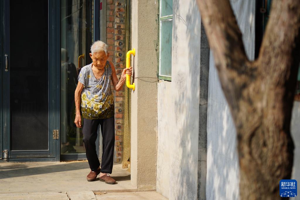9月8日,河北省巨鹿縣后辛莊村95歲的蘆遂扶著適老化改造工程安裝的扶手在院子里行走。