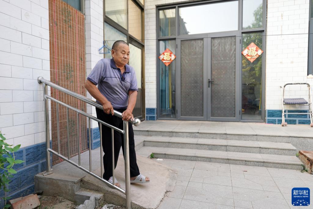 9月8日,河北省巨鹿縣白寨村78歲的張廷軍扶著適老化改造工程安裝的扶手走出屋門。
