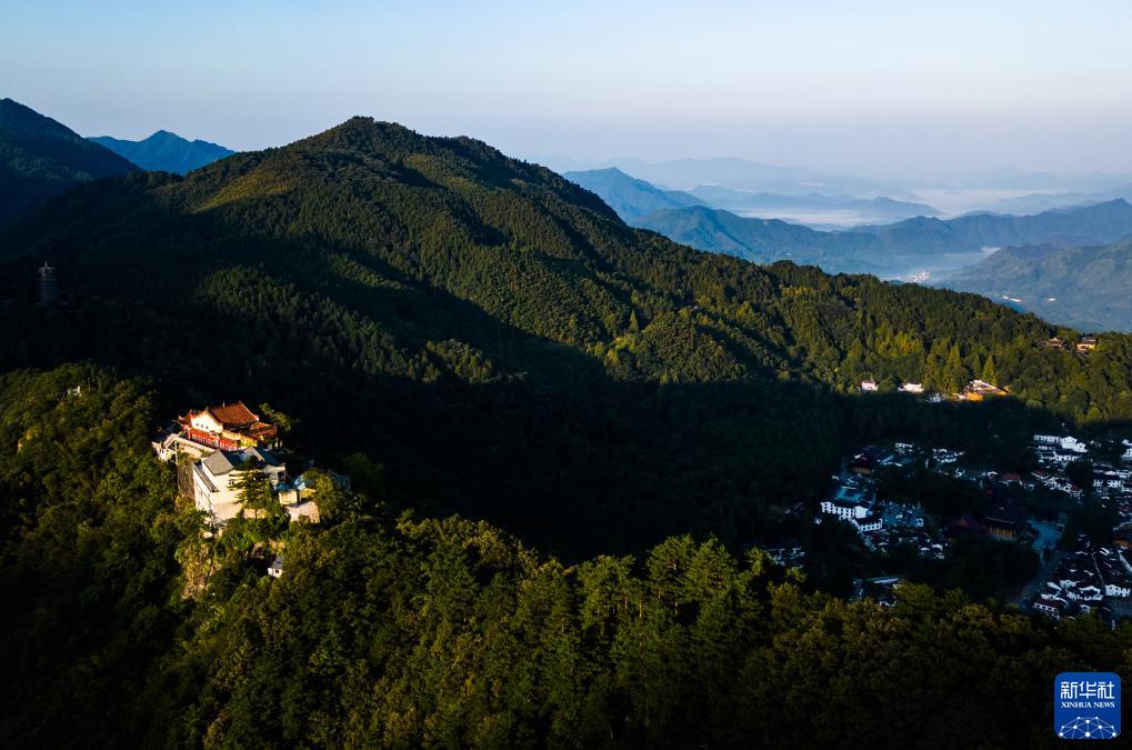 9月9日拍攝的九華山清晨日出時(shí)分景色(無(wú)人機(jī)照片)。