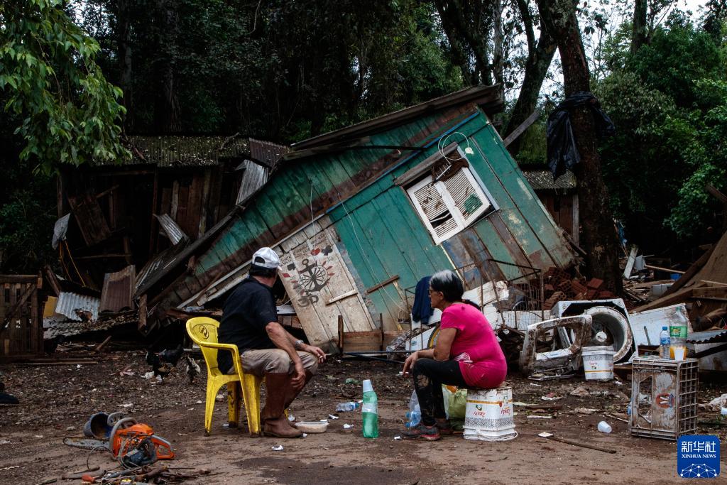 9月8日,在巴西南里奧格蘭德州埃斯特雷拉,人們坐在被洪水損毀的房屋前。