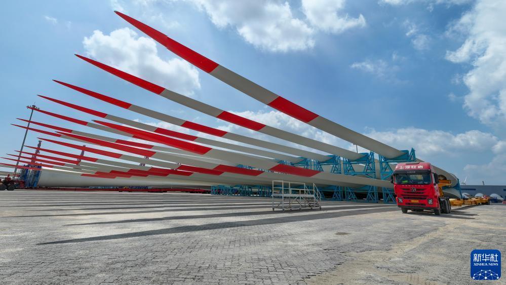 一批風電葉片在江蘇鹽城港射陽港區(qū)碼頭等待運輸(9月8日攝,無人機照片)。