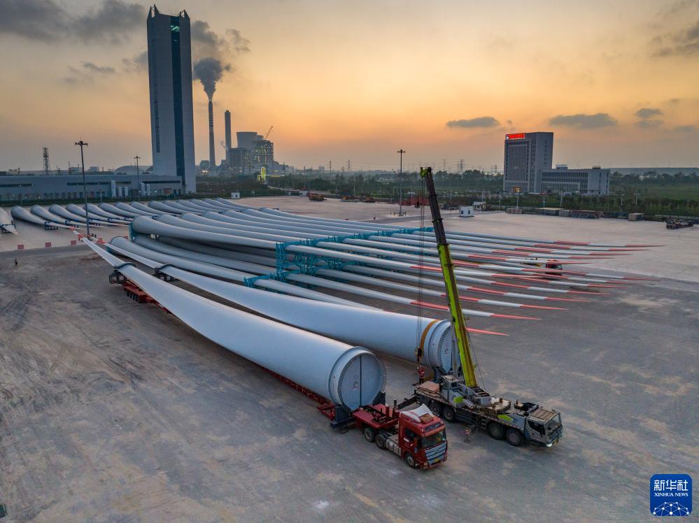一批風(fēng)電葉片在江蘇鹽城港射陽(yáng)港區(qū)碼頭等待運(yùn)輸(9月7日攝,無(wú)人機(jī)照片)。
