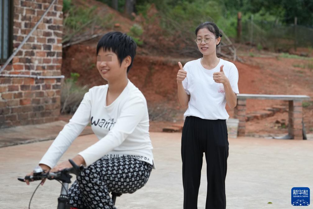 9月7日,陳艷輝(右)在湖南省株洲市茶陵縣界首鎮(zhèn)賀鋪村的小靜家中帶小靜騎單車(chē)。小靜先天智力障礙,對(duì)運(yùn)動(dòng)十分感興趣,陳艷輝和陳二文常帶她跳繩、騎單車(chē)。新華社記者 薛宇舸 攝