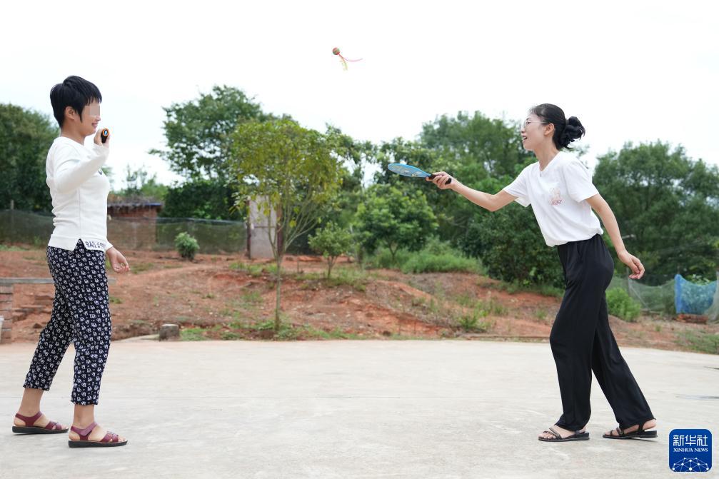 9月7日,陳艷輝(右)在湖南省株洲市茶陵縣界首鎮賀鋪村的小靜家中陪小靜做運動。新華社記者 薛宇舸 攝