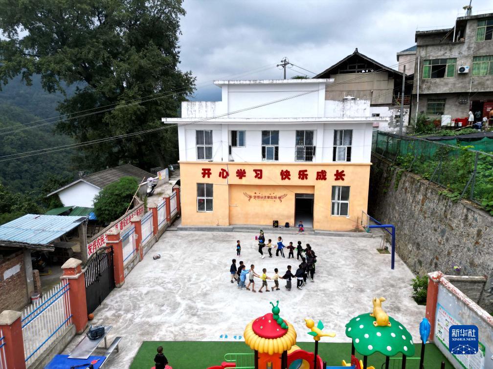 柳吉小學(xué)教師王章艷帶領(lǐng)學(xué)生在課間玩游戲(9月7日攝,無人機照片)。