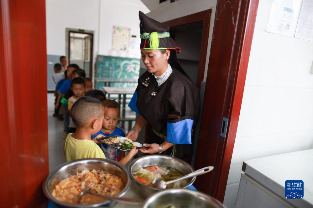 柳吉小學教師王章艷在食堂給學生打飯(9月7日攝)。