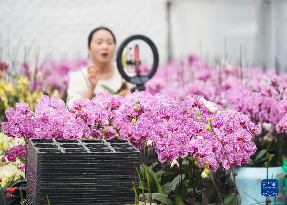 9月9日,工作人員在宿遷市王官集鎮(zhèn)蝴蝶蘭大世界大棚內進行網(wǎng)絡直播。