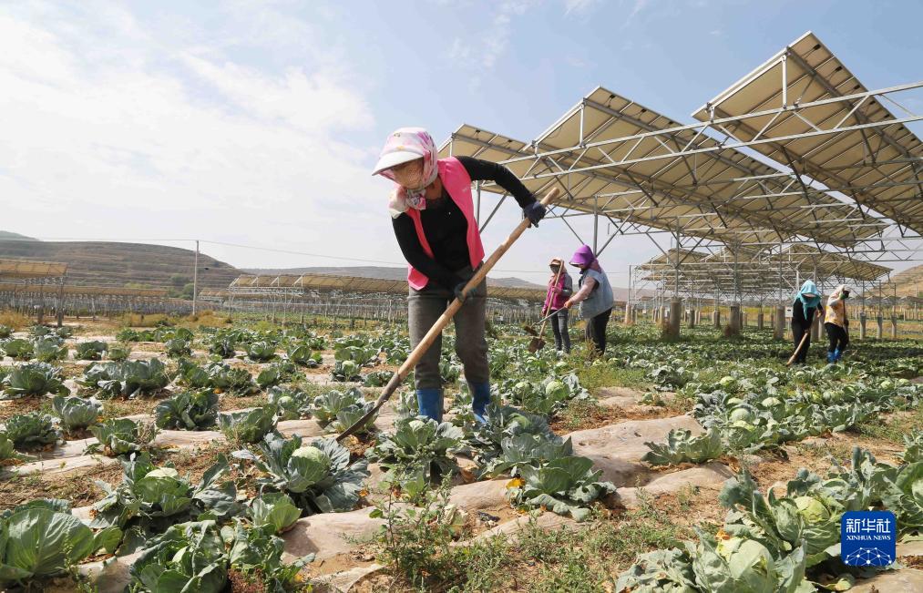 9月9日,農民在通渭縣榜羅鎮四新村光伏農業產業示范園的蔬菜地里勞作。
