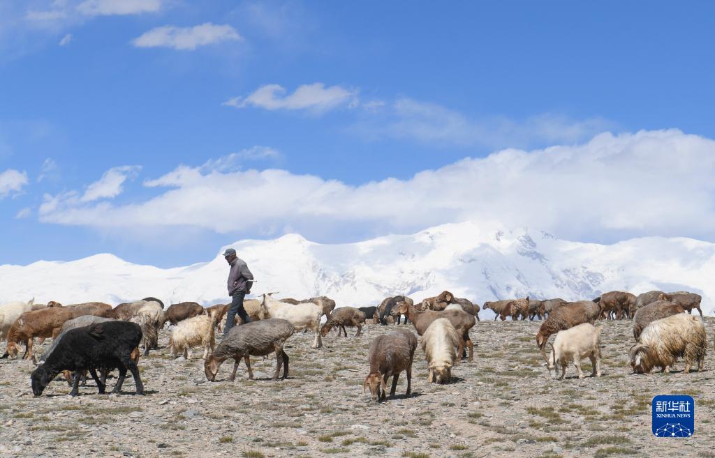 在“冰川之父”慕士塔格峰腳下,新疆塔什庫爾干塔吉克自治縣塔合曼鄉境內的一片天然草場吸引周邊鄉村的牧羊人在此放牧。進入秋季以來,草場漸漸泛黃,屹立于遠處的慕士塔格峰和公格爾九別峰在藍天白云的映襯下格外壯美,一幅寧靜悠遠的牧羊圖引人入勝。