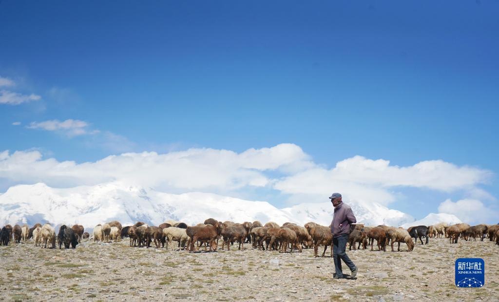在“冰川之父”慕士塔格峰腳下,新疆塔什庫爾干塔吉克自治縣塔合曼鄉境內的一片天然草場吸引周邊鄉村的牧羊人在此放牧。進入秋季以來,草場漸漸泛黃,屹立于遠處的慕士塔格峰和公格爾九別峰在藍天白云的映襯下格外壯美,一幅寧靜悠遠的牧羊圖引人入勝。
