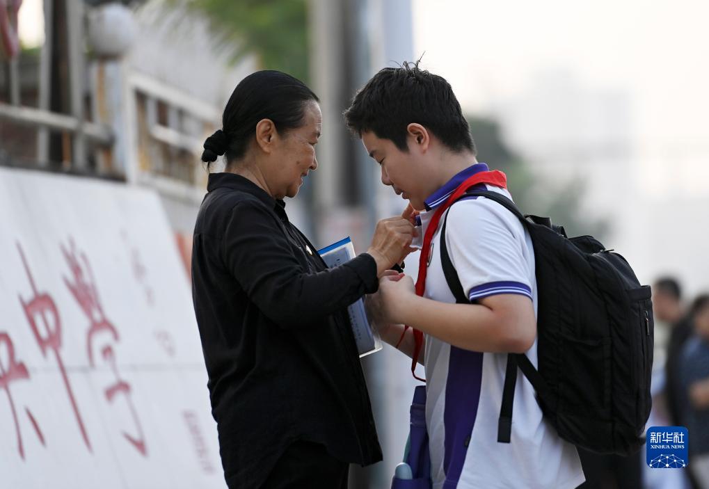 在津英中學門口,張慧穎幫一名學生整理紅領巾(9月8日攝)。