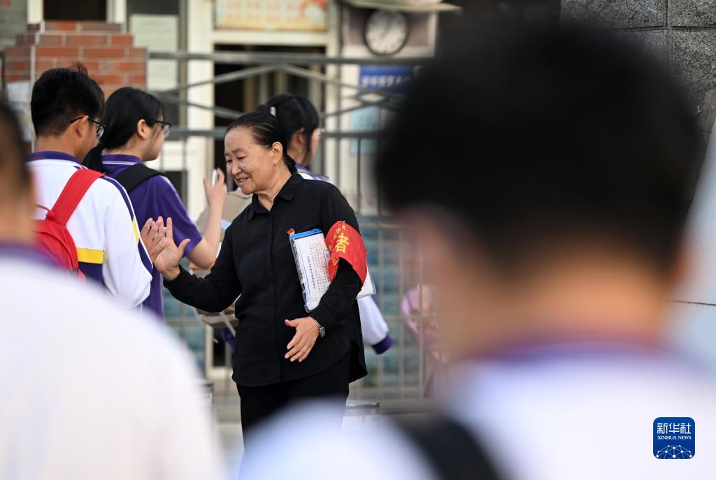 張慧穎在津英中學門口迎接學生入校(9月8日攝)。