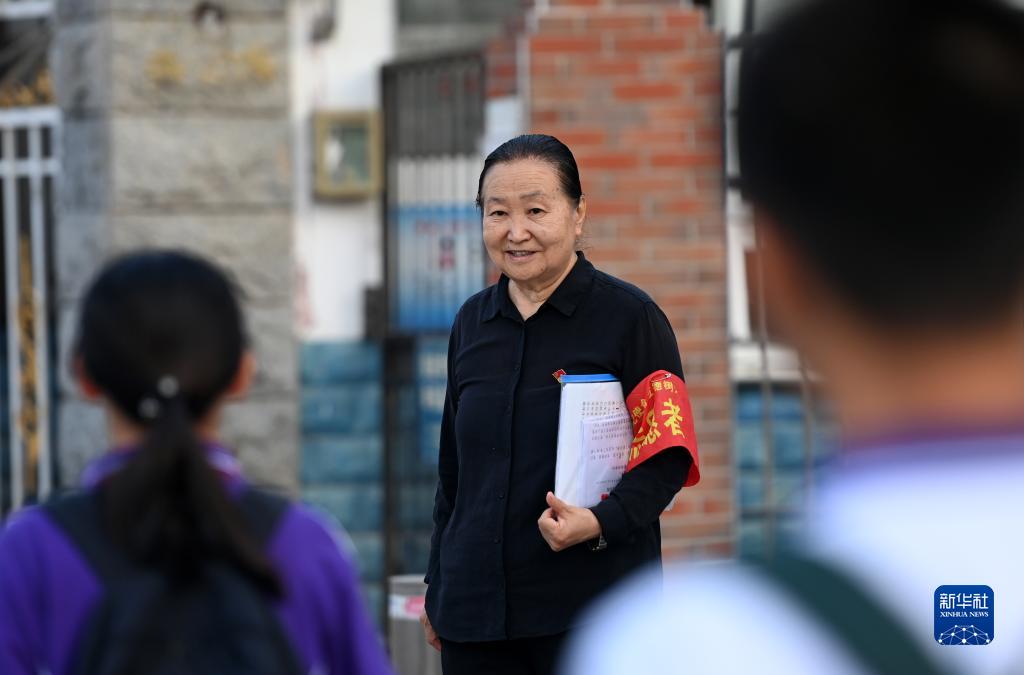 張慧穎在津英中學門口迎接學生入校(9月8日攝)。