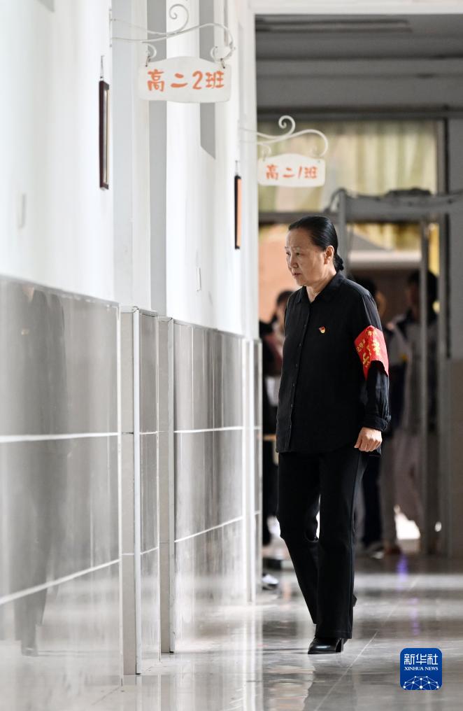 張慧穎在津英中學的教學樓內巡查教學情況(9月8日攝)。