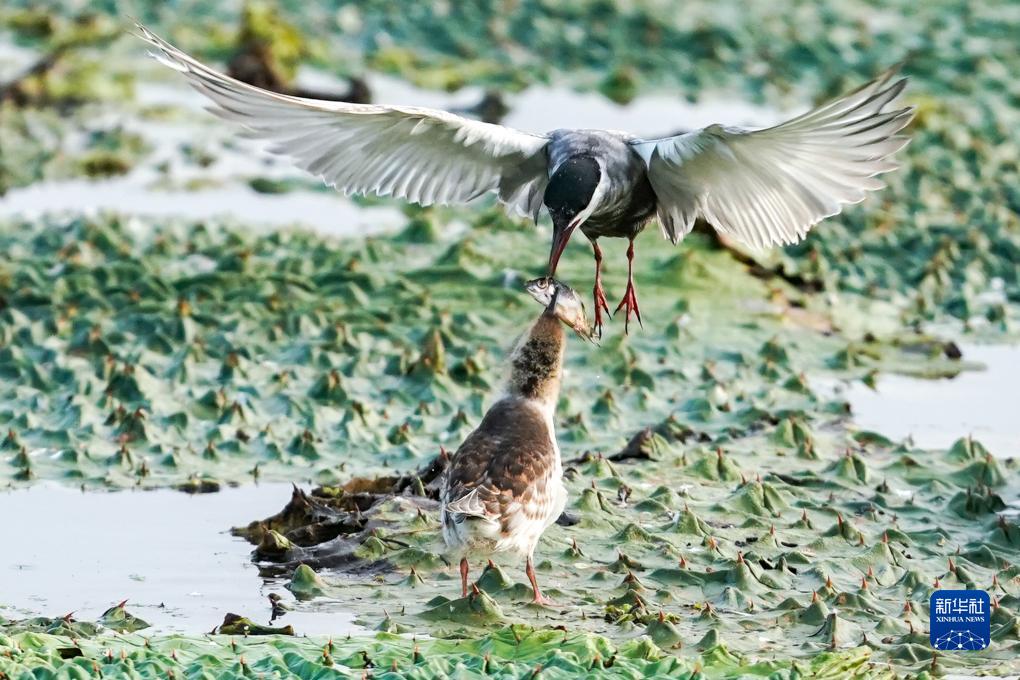 在江蘇省鹽城市建湖縣九龍口國家濕地公園內,須浮鷗銜著小魚給幼鳥喂食(9月7日攝)。