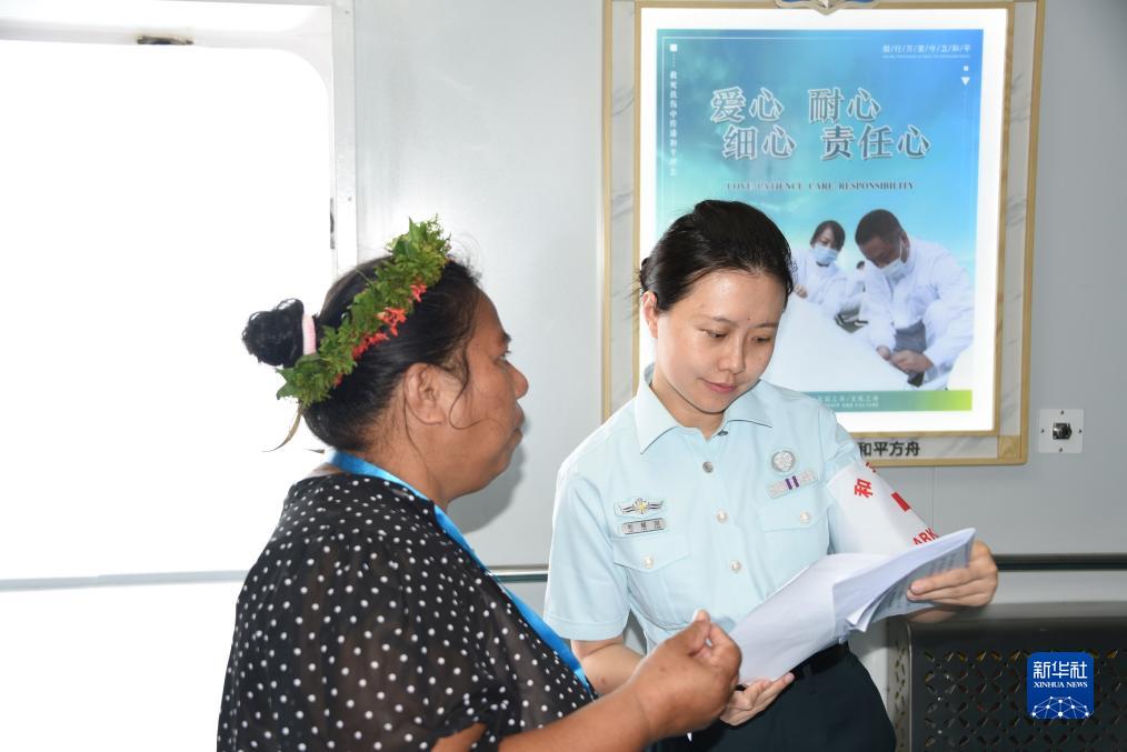 中國海軍“和平方舟”號醫院船在基里巴斯開展醫療服務期間,一名文職醫生為患者解讀化驗報告(7月15日攝)。