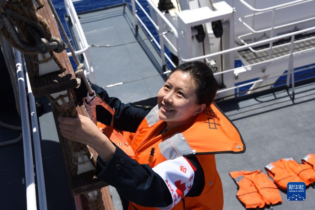 一名文職醫生在中國海軍“和平方舟”號醫院船上進行繩梯攀爬訓練(7月11日攝)。