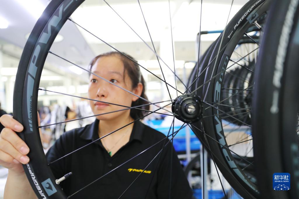 9月9日,在山東樂陵市一家企業(yè)的碳纖維自行車生產(chǎn)車間,工人在檢驗輪組。