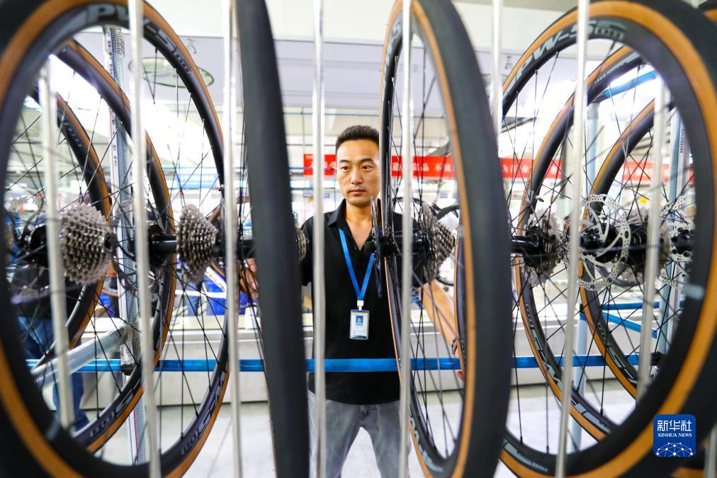 9月9日,在山東樂陵市一家企業的碳纖維自行車生產車間,工人在組裝線備料。新華社發(張進剛 攝)