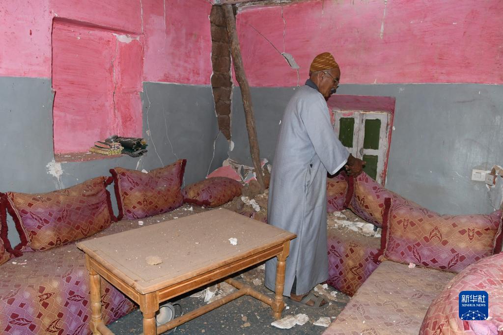 9月9日,在摩洛哥馬拉喀什附近,居民查看遭地震損毀的建筑。