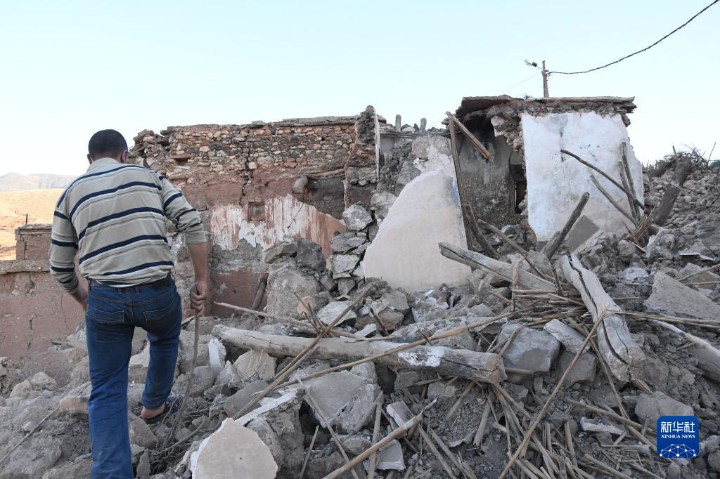 9月9日,在摩洛哥馬拉喀什附近,居民走在遭地震損毀的建筑廢墟上。