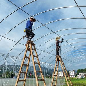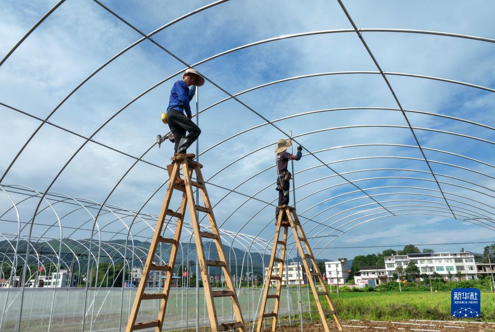 9月9日,工人在常寧市洋泉鎮巷坪村智慧育苗大棚施工現場施工。