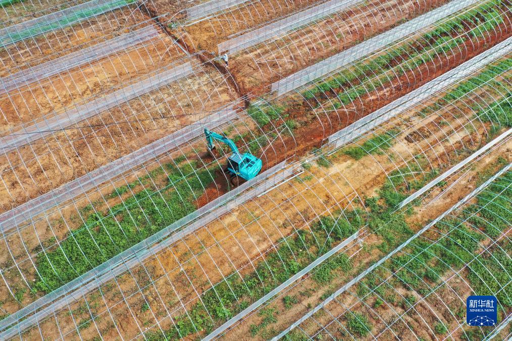 9月9日,工人在常寧市洋泉鎮巷坪村智慧育苗大棚施工現場施工(無人機照片)。
