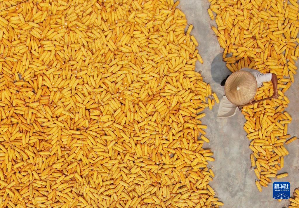 9月10日,在山東省臨沂市地方鎮黃城村,農民在晾曬收獲的玉米(無人機照片)。