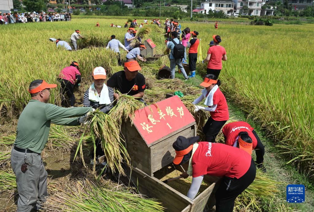9月9日,在湖南省邵陽市洞口縣文昌街道平棟村一片成熟的中稻田地上,農民在進行一場搶收稻谷比賽。
