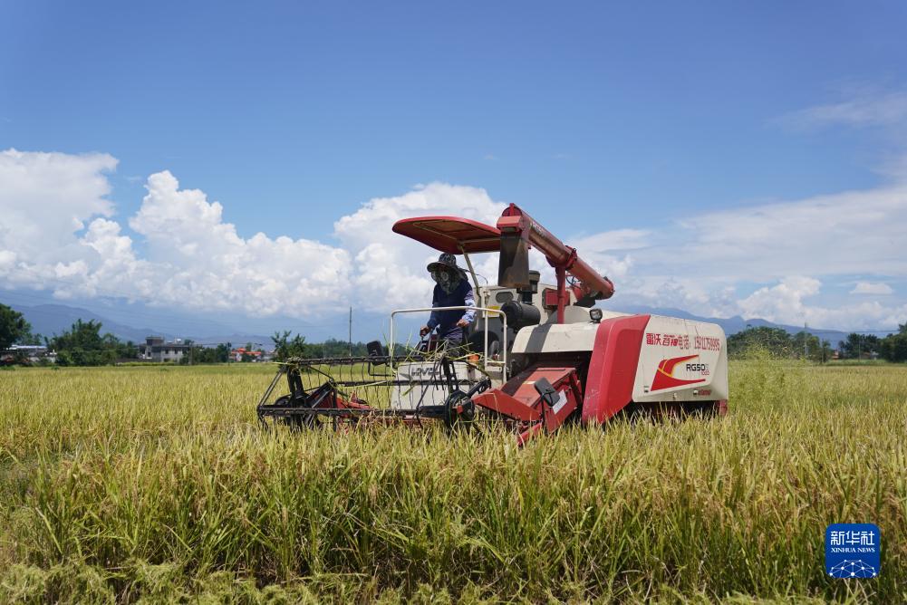 9月8日,村民駕駛農機在云南省盈江縣弄璋鎮收獲稻谷。