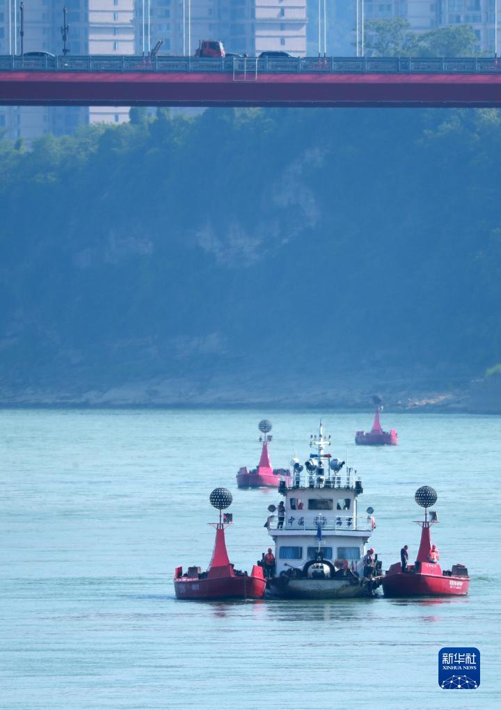 海事及航道部門工作人員在湖北宜昌葛洲壩下游水域調整航道浮標設施,提前應對三峽蓄水水位變化(9月7日攝)。
