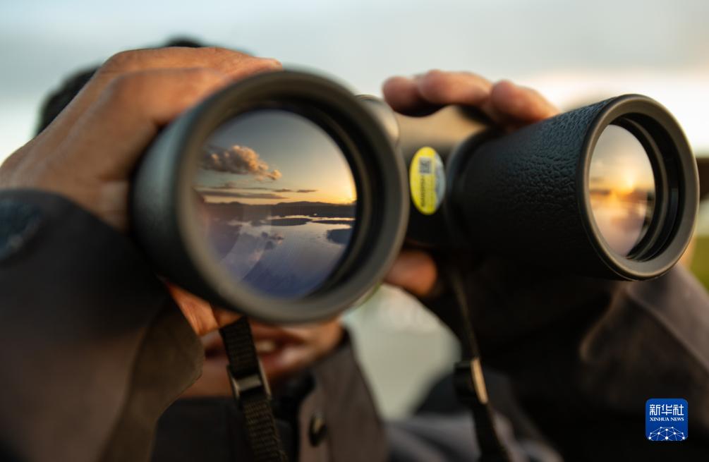 濕地生態(tài)管護員如科在四川省阿壩藏族羌族自治州若爾蓋縣花湖用望遠鏡觀察周邊環(huán)境(8月22日攝)。
