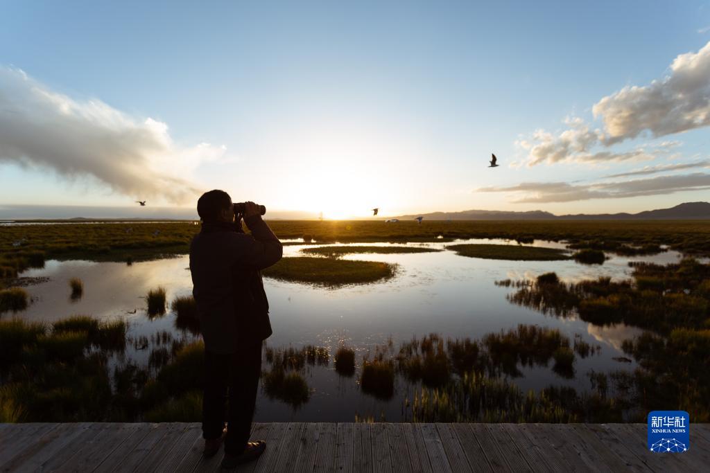 濕地生態(tài)管護(hù)員如科在四川省阿壩藏族羌族自治州若爾蓋縣花湖用望遠(yuǎn)鏡觀察周邊環(huán)境(8月22日攝)。
