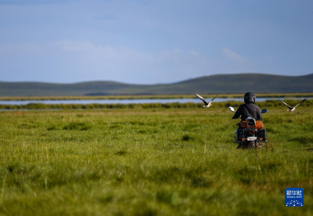 濕地生態(tài)管護(hù)員如科騎著摩托車在四川省阿壩藏族羌族自治州若爾蓋縣花湖周圍巡查(8月22日攝)。