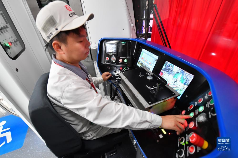 中車株機公司工作人員在中國中車出口墨西哥城輕軌列車首列車內巡檢(9月9日攝)。