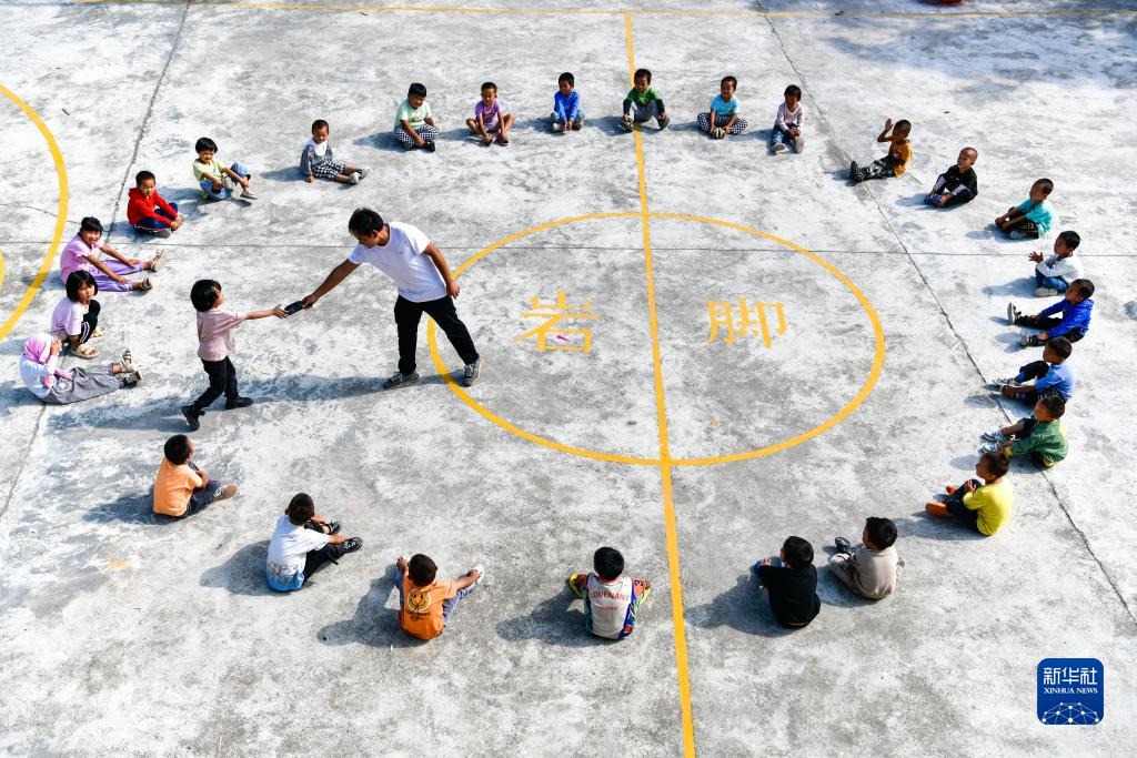 陸成文與學生在體育課上做丟手絹游戲(9月6日攝)。