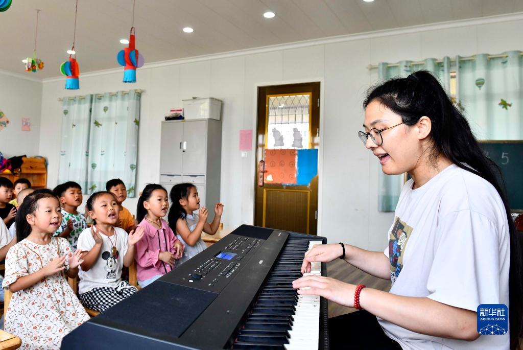9月5日,在微山縣高樓鄉渭河小學,音樂老師劉夢然在教學前班的孩子們唱兒歌。