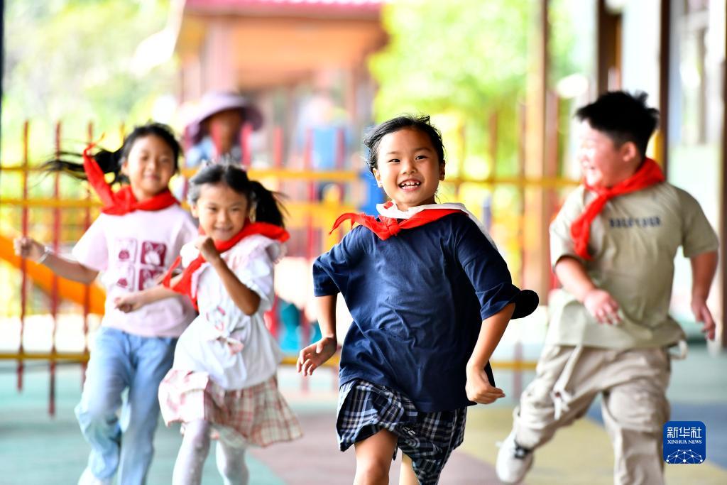 9月5日,在微山縣高樓鄉(xiāng)渭河小學(xué),孩子們?cè)谡n間做游戲。