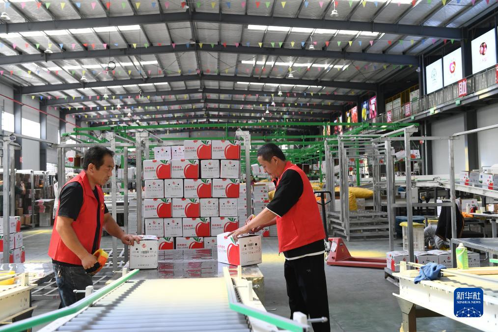 9月10日,在洛川蘋果現代產業園,工作人員將蘋果裝箱。